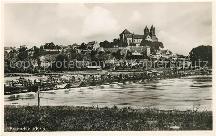 AK / Ansichtskarte Breisach_Rhein Uferpartie am Rhein Schiffsbruecke Blick zum Muenster Breisach Rhein