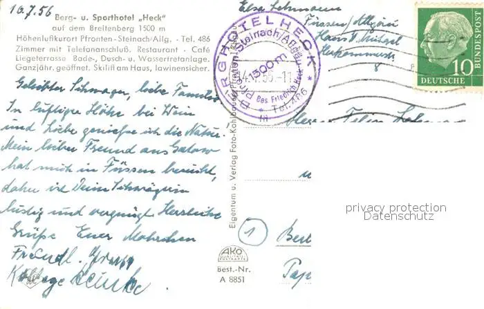Breitenberg_Pfronten Hotel Heck Breitenberg Pfronten postalisch gelaufen 1956 Erhaltung siehe scans [KathaD81] Kathoren