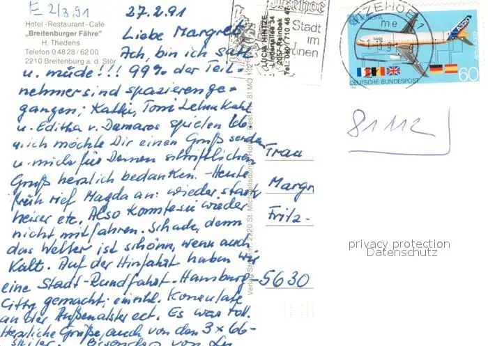 Breitenburg Hotel Restaurant Café Breitenburger Faehre Breitenburg postalisch gelaufen 1991 Erhaltung siehe scans [FriedD77] Frierer
