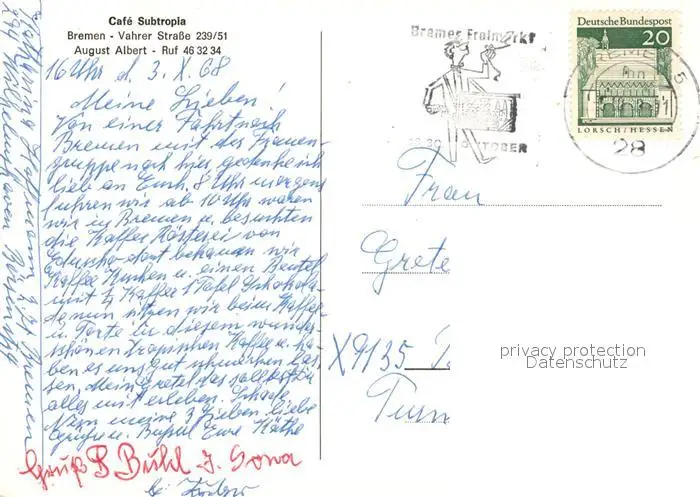 Bremen Cafe Subtropia Bremen postalisch gelaufen 1968 Erhaltung siehe scans [FriedD77] Frierer
