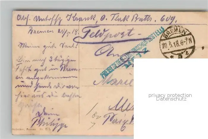 Bremen Freihafen Bremen postalisch gelaufen 1918 Feldpost - Stempel Erhaltung siehe scans [KathaD81] Feldpost - Stempel Kathoren
