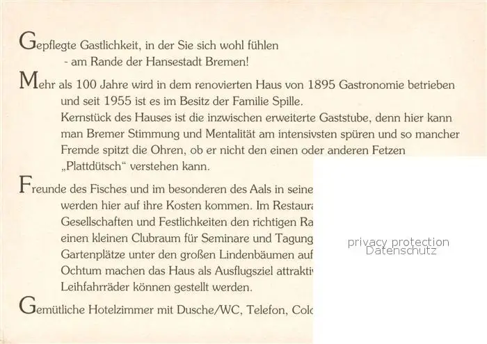 Bremen Gasthaus Hotel Spille Restaurant Zimmer Terrasse Bremen postalisch nicht gelaufen nach 1965 Werbekarte (keine Postkarte) Erhaltung siehe scans [WerneD78] Werbekarte (keine Postkarte) WernPID7