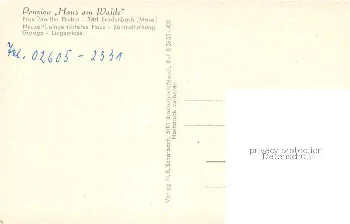 Brodenbach Pension Haus am Walde Brodenbach postalisch nicht gelaufen 1921-1965 Erhaltung siehe scans [FriedD77] Frierer