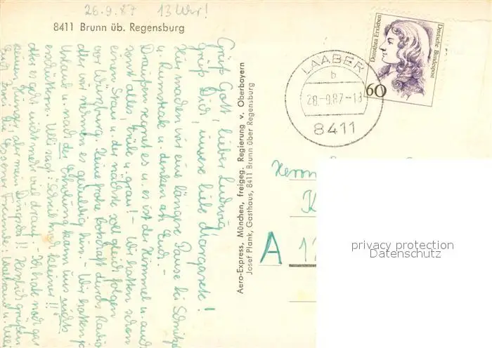Brunn Regensburg Kategorie Alte Ansichtskarten Postkarten bx60724 Brunn_Regensburg Fliegeraufnahme Brunn Regensburg postalisch gelaufen 1987 Erhaltung siehe scans [KathaD81]