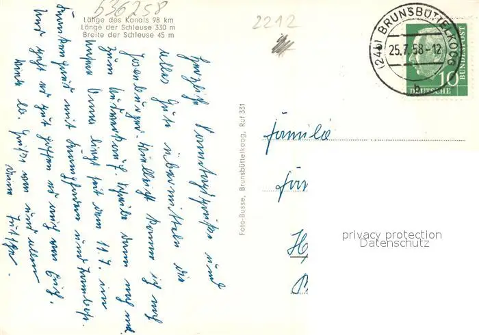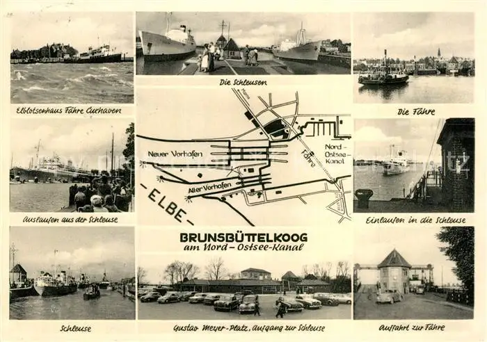 Brunsbuettelkoog Kategorie Alte Ansichtskarten Postkarten bx77320 Brunsbuettelkoog Elblotsenhaus Faehre Schleuse Nord Ostsee Kanal Gustav Meyer Platz Brunsbuettelkoog postalisch gelaufen 1958 Erhaltung siehe scans [FriedD77]