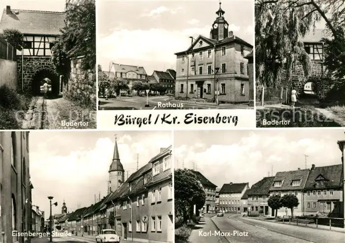 AK / Ansichtskarte Buergel_Thueringen Badertor Rathaus Eisenberger Strasse Karl Marx Platz Buergel Thueringen