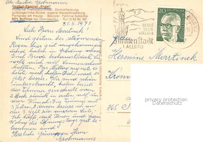 Buflings Gasthof Pension Engel Gastraeume Buflings postalisch gelaufen 1971 Erhaltung siehe scans [WerneD78] WernPID7
