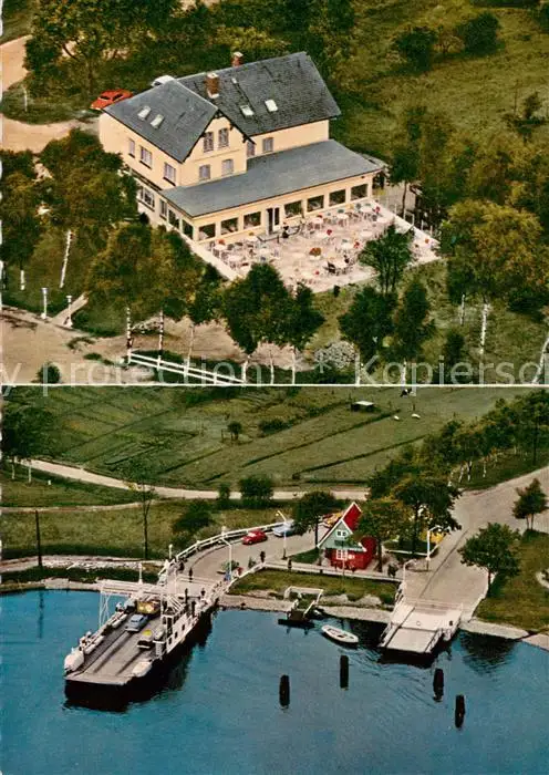 AK / Ansichtskarte Burg_Dithmarschen Hotel Pension Burger Faehrhaus mit Faehre Fliegeraufnahme Burg Dithmarschen