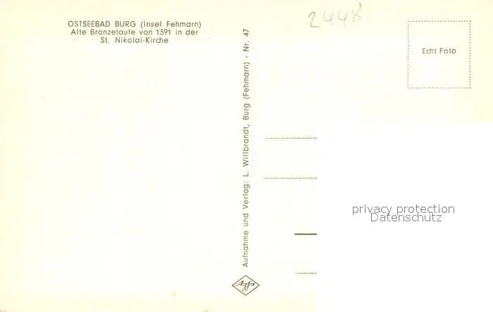 Burg_Fehmarn Alte Bronzetaufe von 1391 in der St. Nikolai Kirche Burg Fehmarn postalisch nicht gelaufen 1921-1965 Erhaltung siehe scans [FriedD77] Frierer