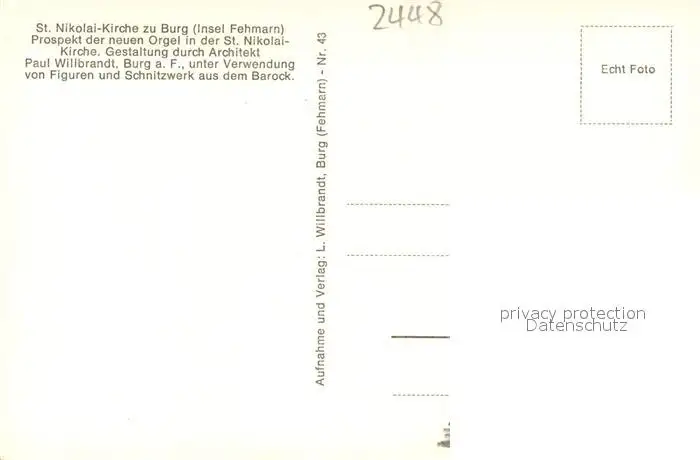 Burg_Fehmarn St. Nikolai Kirche Neue Orgel Burg Fehmarn postalisch nicht gelaufen 1921-1965 Erhaltung siehe scans [FriedD77] Frierer
