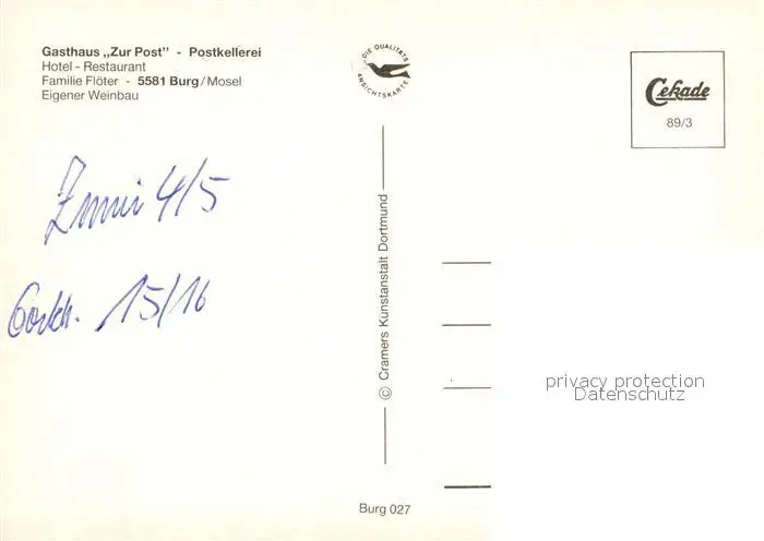 Burg_Mosel Gasthaus Zur Post Postkellerei Gaststube Terrasse Burg_Mosel postalisch gelaufen nach 1965 Erhaltung siehe scans [WerneD78] WernPID7