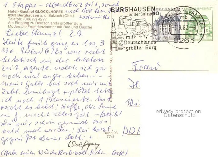 Burghausen_Salzach Hotel Gasthof Gloecklhofer Restaurant Stadtpanorama mit Burg und Kirche Burghausen Salzach postalisch gelaufen 1982 Erhaltung siehe scans [FriedD77] Frierer