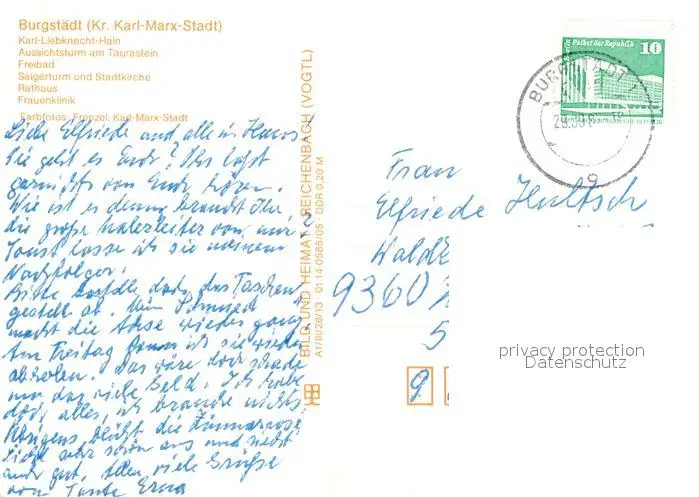 Burgstaedt_Sachsen Karl Liebknecht Hain Aussichtsturm am Turastein Freibad Saengerturm und Stadtkirche Rathaus Frauenklinik Burgstaedt_Sachsen postalisch gelaufen 1987 Erhaltung siehe scans [WerneD78] WernPID7
