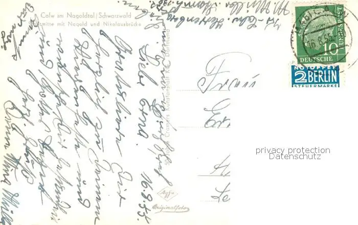 Calw Stadtmitte mit Nagold und Nikolausbruecke Calw postalisch gelaufen 1955 Erhaltung siehe scans [WerneD78] WernPID7