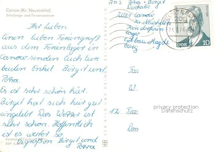 Canow Kategorie Alte Ansichtskarten Postkarten bx59486 Canow Schulungs und Ferienzentrum Spielplatz Bootssteg Teich Canow postalisch gelaufen 1974 Erhaltung siehe scans [WerneD78]