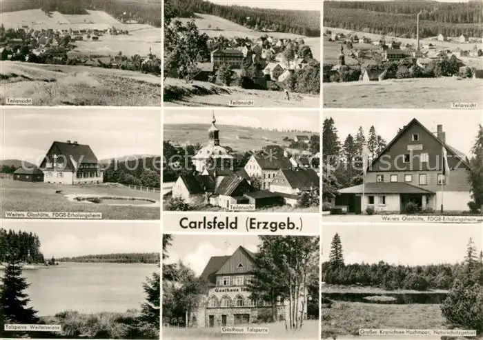 AK / Ansichtskarte Carlsfeld_Erzgebirge Teilansichten Glashuette FDGB Erholungsheim Talsperre Weiterswiese Gasthaus Kranichsee Hochmoor Naturschutzgebiet Carlsfeld Erzgebirge