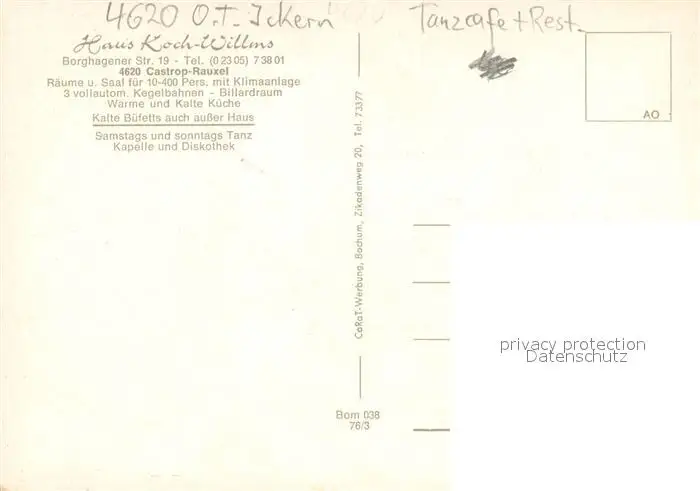 Castrop-Rauxel Haus Koch Willms Bar Gastraeume Kegelbahn Castrop-Rauxel postalisch nicht gelaufen nach 1965 Erhaltung siehe scans [WerneD78] WernPID7