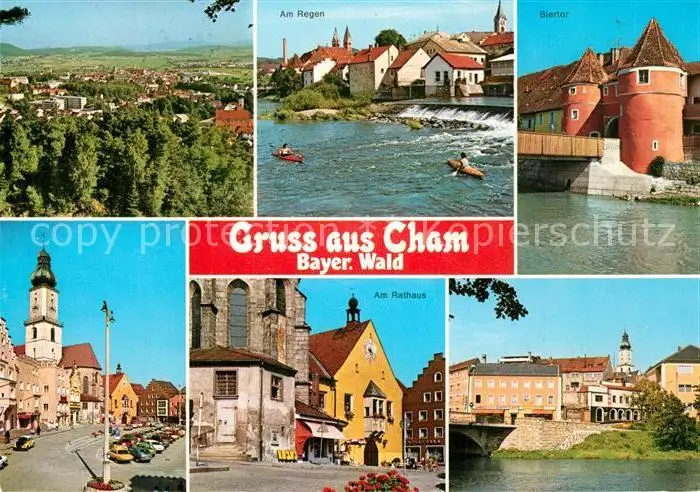 AK / Ansichtskarte Cham_Oberpfalz Stadtpanorama Am Regen Wehr Biertor Marktplatz Kirche Rathaus Cham Oberpfalz