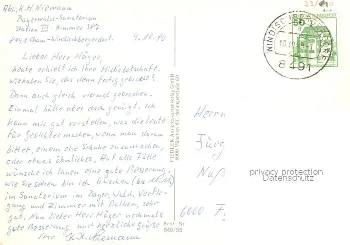 Cham_Oberpfalz Stadtpanorama Am Regen Wehr Biertor Marktplatz Kirche Rathaus Cham Oberpfalz postalisch gelaufen 1980 Erhaltung siehe scans [FriedD77] Frierer