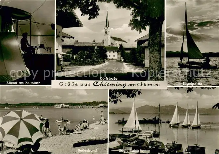 AK / Ansichtskarte Chieming_Chiemsee Abend am Zeltplatz Dorfstrasse Kirche Segeln Badestrand Seglerhafen Chieming Chiemsee