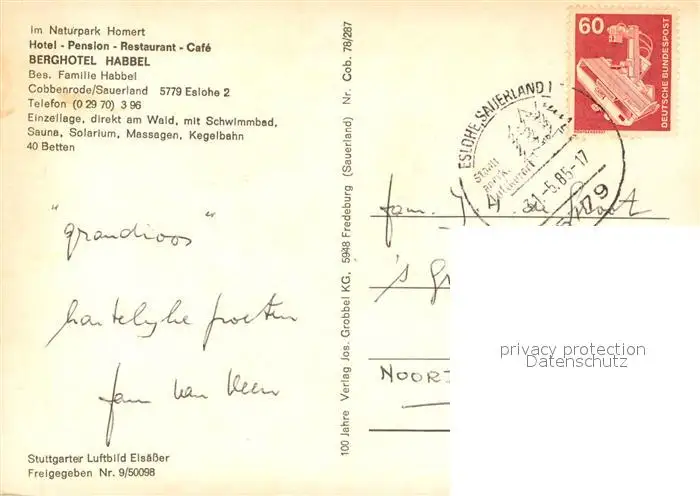 Cobbenrode_Sauerland Fliegeraufnahme Hotel Pension Berghotel Habbel Cobbenrode_Sauerland postalisch gelaufen 1985 Erhaltung siehe scans [LiesaD40] LiesID40