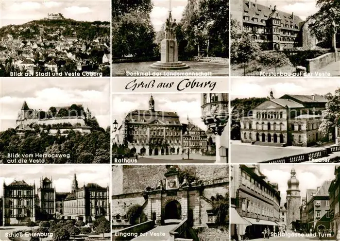 AK / Ansichtskarte Coburg Stadt und Veste Coburg Denkmal der Landesmannschaft Fuerstenbau auf der Veste Blick vom Herzogsweg Rathaus Theater Schloss Ehrenburg Eingang Spitalgasse und Turm Coburg