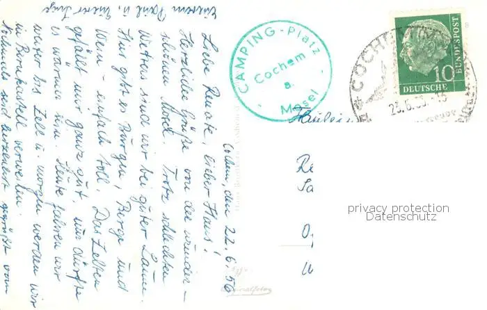 Cochem_Kochem_Mosel Fliegeraufnahme mit Burg und Campingplatz postalisch gelaufen 1956 Erhaltung siehe scans [WerneD78] WernPID7