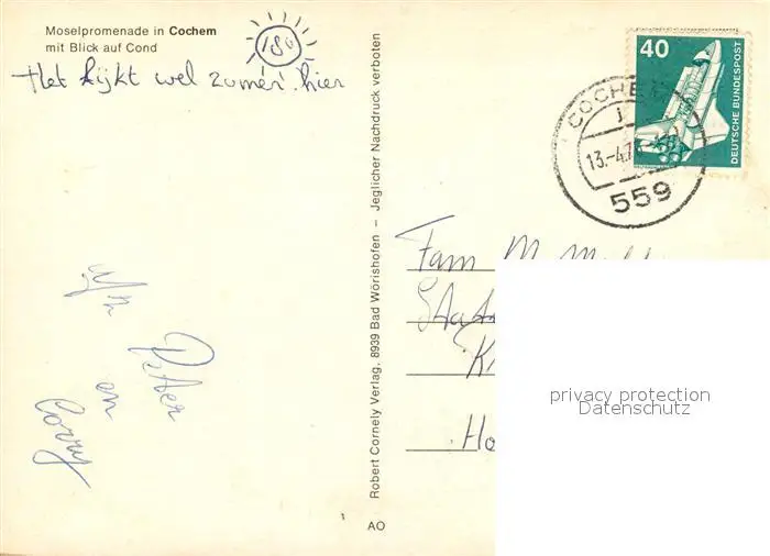 Cochem_Mosel Blick auf Cond Cochem Mosel postalisch gelaufen 1976 Erhaltung siehe scans [KathaD81] Kathoren