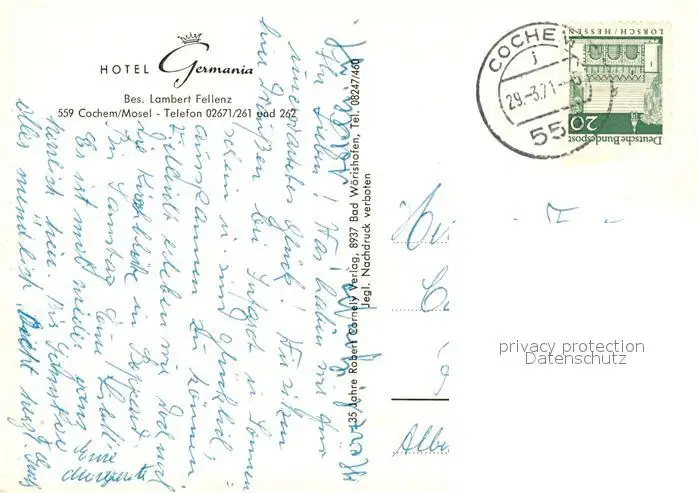 Cochem_Mosel Hotel Germania Terrasse Cochem Mosel postalisch gelaufen 1971 Erhaltung siehe scans [WerneD78] WernPID7