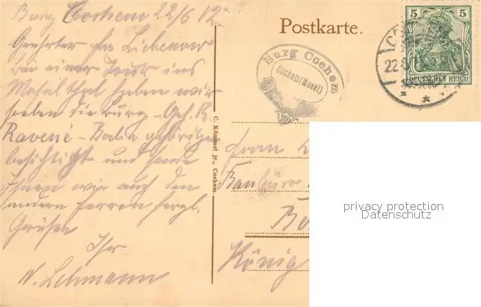 Cochem_Mosel Panorama Blick auf Reichsburg Moseltal vom Haus Krein gesehen Cochem Mosel postalisch gelaufen 1912 Erhaltung siehe scans [FriedD77] Frierer