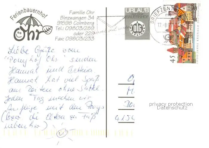 Colmberg Ferienbauernhof Ohr Kinderspielplatz Brotzeit Colmberg postalisch gelaufen 2005 Erhaltung siehe scans [WerneD78] WernPID7