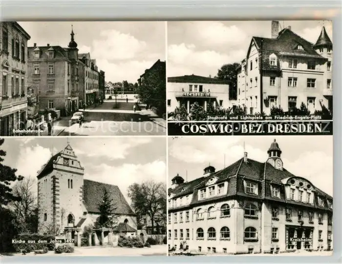 AK / Ansichtskarte Coswig_Sachsen Bahnhofstrasse Kirche 15. Jhdt. Stadtcafe Lichtspiele Friedrich Engels Platz Kreisheim Coswig Sachsen