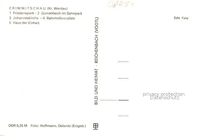 Crimmitschau Friedenspark Gondelteich im Sahnpark Johanneskirche Bahnhofsvorplatz Haus der Einheit Crimmitschau postalisch nicht gelaufen 1985 Erhaltung siehe scans [FriedD77] Frierer