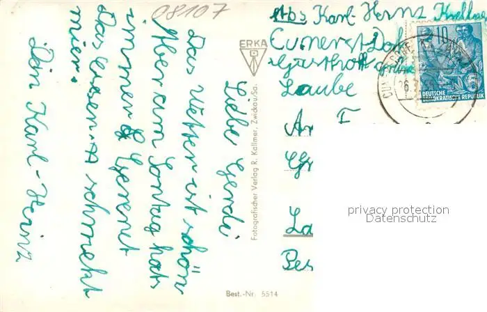Cunersdorf_Kirchberg Gasthof Gruene Laube Cunersdorf Kirchberg postalisch gelaufen 1955 Erhaltung siehe scans [WerneD78] WernPID7