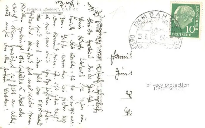 Dahme__Ostseebad_Holstein Fliegeraufnahme Zeltplatz Zedano postalisch gelaufen 1957 Erhaltung siehe scans [LiesaD40] LiesID40