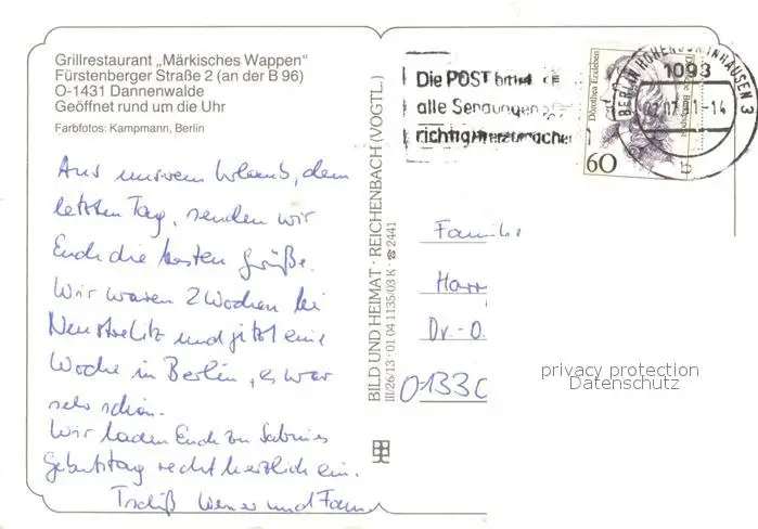 Dannenwalde_Gransee Restaurant M?rkisches Wappen Dannenwalde Gransee postalisch gelaufen nach 1965 Erhaltung siehe scans [LiesaD40] LiesID40