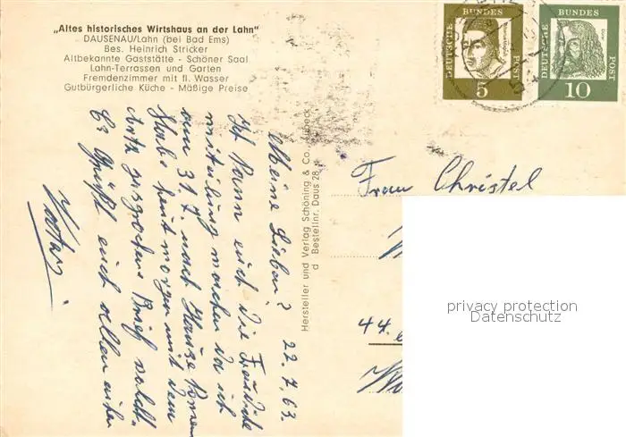 Dausenau Altes Wirtshaus an der Lahn Gaststube Stadttor Dausenau postalisch gelaufen 1963 Erhaltung siehe scans [WerneD78] WernPID7