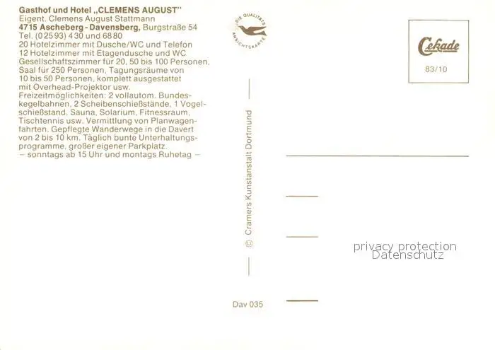 Davensberg Gasthaus Hotel Clemens August Davensberg postalisch nicht gelaufen nach 1965 Erhaltung siehe scans [LiesaD40] LiesID40