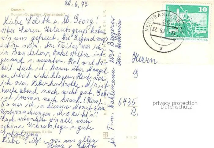 Demmin_Mecklenburg_Vorpommern Konsum Gaststaette Gartenstadt Demmin_Mecklenburg postalisch gelaufen 1977 Erhaltung siehe scans [WerneD78] WernPID7