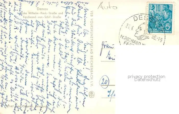 Dessau Rosslau Kategorie Alte Ansichtskarten Postkarten bx52897 Dessau Rosslau Wilh Piek Str Ecke Ferdinand von Schill Str Dessau Rosslau postalisch gelaufen 1956 Erhaltung siehe scans [WerneD78]