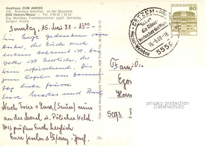 Detzem Gasthaus zum Anker Moselpartie Panorama Detzem postalisch gelaufen 1988 Erhaltung siehe scans [WerneD78] WernPID7