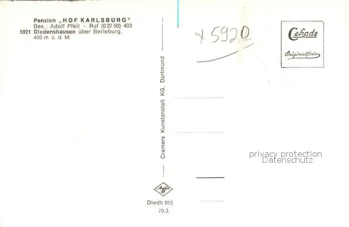 Diedenshausen_Wittgenstein Pension Hof Karlsburg Diedenshausen postalisch nicht gelaufen 1970 Erhaltung siehe scans [FriedD77] Frierer