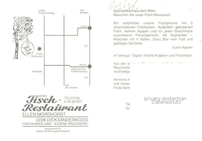 Dieksanderkoog Fisch Restaurant Ellen Mordhorst Gaststube Fischtheke Bootshafen Dieksanderkoog postalisch nicht gelaufen nach 1965 Werbekarte (keine Postkarte) Erhaltung siehe scans [WerneD78] Werbekarte (keine Postkarte) WernPID7