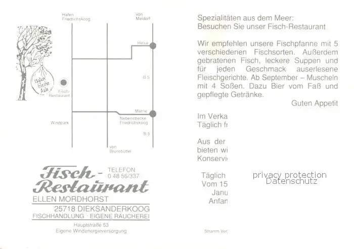 Dieksanderkoog Fisch-Restaurant Informationen Dieksanderkoog postalisch nicht gelaufen nach 1965 Werbekarte (keine Postkarte) Erhaltung siehe scans [LiesaD40] Werbekarte (keine Postkarte) LiesID40