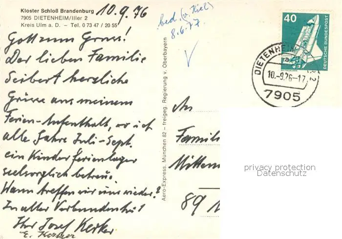 Dietenheim_Iller Kloster Schloss Brandenburg an der Iller Fliegeraufnahme Dietenheim_Iller postalisch gelaufen 1976 Erhaltung siehe scans [FriedD77] Frierer