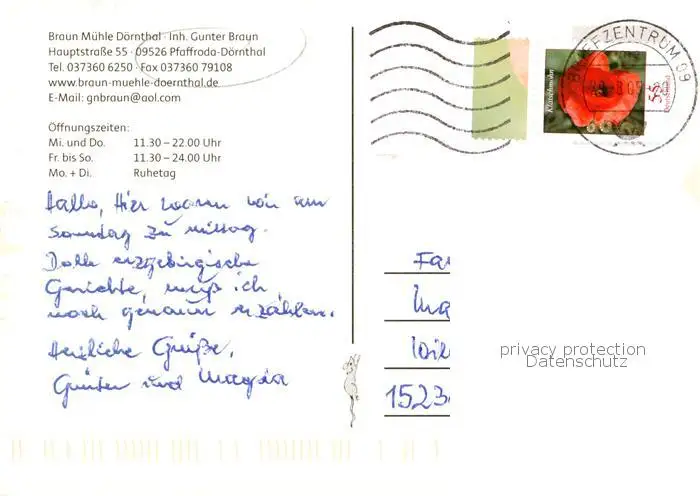 Doernthal-Pfaffroda_Erzgebirge Braun Muehle Gaststaette Wasserrad postalisch gelaufen 2005 Erhaltung siehe scans [FriedD77] Frierer