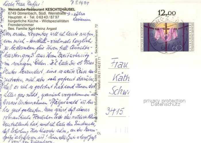 Doerrenbach Weinstube Restaurant Keschtehaeusel Gaststube Stadtblick Kirche Doerrenbach postalisch gelaufen 1984 Erhaltung siehe scans [WerneD78] WernPID7