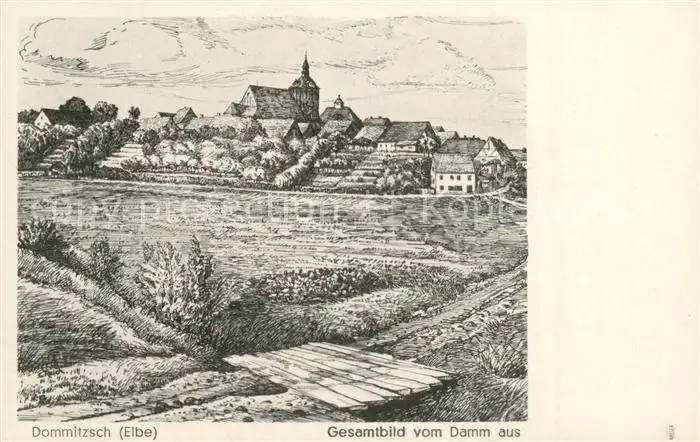 Dommitzsch Gesamtbild vom Damm aus Kuenstlerkarte Dommitzsch postalisch nicht gelaufen 1921-1965 Erhaltung siehe scans [FriedD77] Frierer