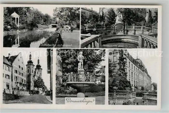 AK / Ansichtskarte Donaueschingen Schlossgarten mit Brigach Donauquelle Stadtkirche Hanselebrunnen Donaueschingen