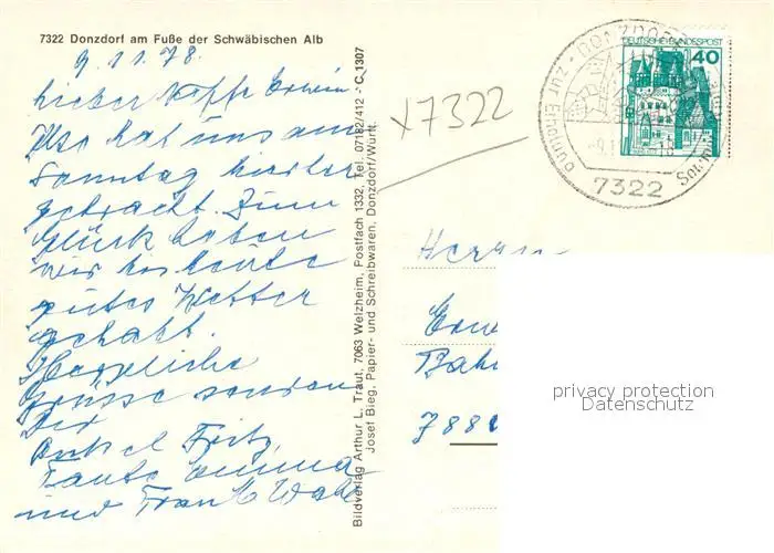 Donzdorf Panorama Schwaebische Alb Kirche Hauptstrasse Schloss Donzdorf postalisch gelaufen 1978 Erhaltung siehe scans [FriedD77] Frierer